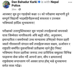 कक्षा १२ परीक्षार्थीलाई आईजीपी दानबहादुर कार्कीको शुभकामना: ‘राष्ट्रसेवामा समर्पित युवा शक्तिको प्रतीक्षा’