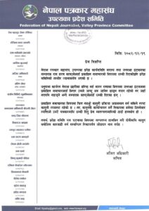 महासंघले घटनाको निष्पक्ष छानबिन गरी दोषीलाई कानुनअनुसार कारबाही गर्न सम्बन्धित निकायसँग माग गरेको छ। साथै पत्रकारलाई सुरक्षित र स्वतन्त्र वातावरणमा काम गर्न दिन र प्रेस स्वतन्त्रताको पूर्ण सम्मान गर्न सबै पक्षलाई आग्रह गरेको छ।