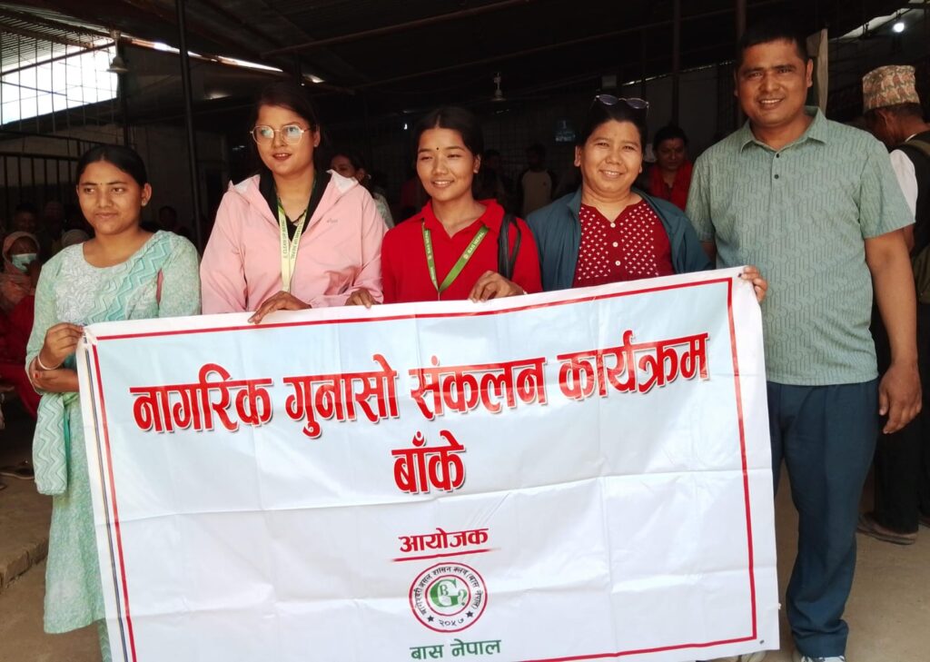बैशाख । नेपालगञ्ज बास नेपालको आयोजनामा बिहीबार भुमिसुधार तथा मालपोत कार्यालय बाँकेमा सेवाग्राहीहरुबाट नागरिक गुनासो संकलन गरेको छ ।सुशासन प्रबद्र्धन, सार्बजनिक गुनासो ब्यवस्थापमा सहजिकरन तथा सरकारी कार्यालयको ्सेवा प्रवाहमा थप सुधार ल्याउने उद्धेश्यले सेवाग्राहीहरुको बढी चाप रहने कार्यालयहरुम सञ्चालन गर्दै आएको उक्त नागरिक गुनासो संकलन कार्यक्रम आज मालपोत कार्यालयमा आयोजना गरेका हो ।कार्यालय समयमा सेवाग्राहीहरुबाट संकललित गुनासोहरुलाई कार्यालय प्रमुख समक्ष पेश गरी समस्या समाधान गर्नका लागि पहल गर्दै आएको र सोही अनुरुप आज जिल्लाका बिभिन्न पालिकाहरु तथा अन्य जिल्लाहरुबाट समेत सेवा लिन आएका सेवाग्राहीलाई भेटी उनीहरुका समस्याहरु टिपोट गरेको छ ।पहिले्को तुलनामा कार्यालयबाट प्रवाह हुने सेवामा केही सुधार भएतापनि संकलित गुनासाहरुमा एउटै काकमका लागि पटक पटक धाउनसपर्ने समस्या भएको,सहायता कक्ष नभएको, सेवाग्राहीहरुको भिडभाड हुने भएकाले टोकन सिस्टमको ब्यवस्था हुनुपर्ने, सेवाग्राहीहरुलाई पिउने पानीको ब्यवस्था नभएको, सहज सथानमा शौचालयको ब्यवस्था नभएको, कार्यालय प्राङ्गनमा ्सफा नभएको, प्रर्याप्त रुपमा सेवाग्राहीहरु बस्नको लागि ब्यवस्था नभएको, सबै सेवा एकै स्थानबाट प्रवाह हुनुपर्ने, पार्किङ अब्यवस्थित लगायतका रहेका छन् ।उक्त गुनासो संकलन कार्यक्रमका संयोजक माधव कार्की सहित बास नेपालका मिना घर्ति, ज्योती बुढामगर, ज्योती दास, रचना चौधरी र संगिता बिकले उक्त कार्यालयमा सेवा लिन आएका सेवाग्राहीहरु सँग गुनासो संकलन गरेका थिए