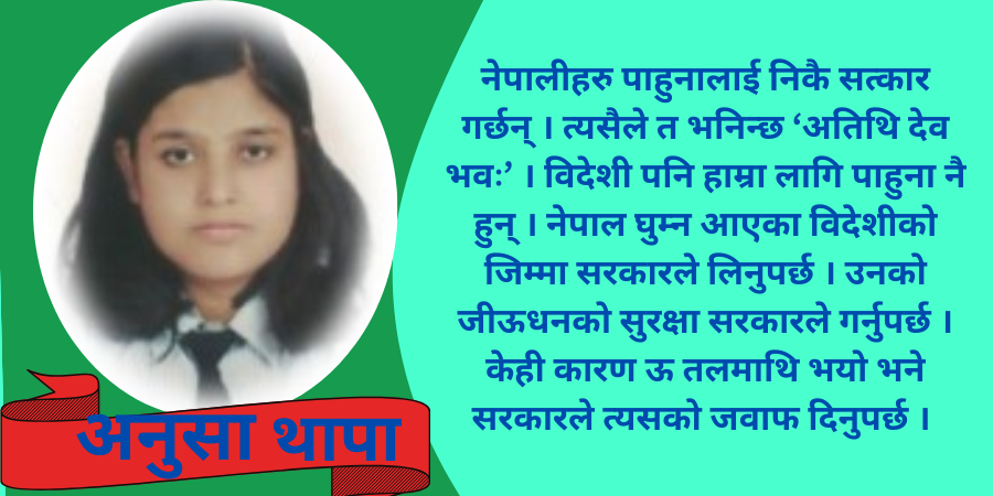 नेपालीहरु पाहुनालाई निकै सत्कार गर्छन् । त्यसैले त भनिन्छ ‘अतिथि देव भवः’ । विदेशी पनि हाम्रा लागि पाहुना नै हुन् । नेपाल घुम्न आएका विदेशीको जिम्मा सरकारले लिनुपर्छ । उनको जीऊधनको सुरक्षा सरकारले गर्नुपर्छ । केही कारण ऊ तलमाथि भयो भने सरकारले त्यसको जवाफ दिनुपर्छ ।
